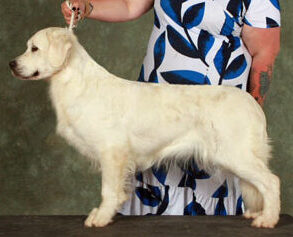We are proud to announce that PIPPA easily achieved her championship after having raised her first litter. Substantial , well boned, and confidently outgoing, Pippa is medium cream female with a correct and slightly wavy coat . Exceptionally kind in nature, she is a beloved family pet and a phenomenal dam.