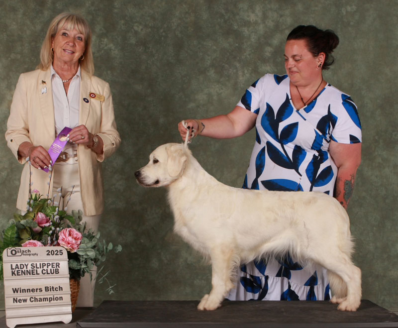 Coco is one of our favourite ” newcomers” . She has now formally joined the Kyon breeding program having passed all her clearances with ease. She also achieved her championship in the blink of an eye, with large major wins in very stiff competition. We are excited about what future will show and look forward to seeing the pups that might come from this classic and extremely British breed-typical female! Her homebred pedigree consists of many of our all time favourite Goldens . Coco has a sweet and gentle disposition with a highly biddable nature. Show her what you want her to do, and she will quickly oblige. This girl loves to please !
