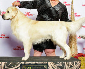 We are beyond thrilled with EVERETT, who has become such an influential sire for Kyon. He achieved all his clearances with ease and his championship in fabulous style. A loving and kind dog Everett is of moderate height, but has loads of substance and bone . He stands 23.5 ” tall and weighs 82 lbs. Everett has excellent working drive , loves the water and is a happy-go-lucky personality . He is of a true cream colour and exquisite British style. He carries a dense and correctly wavy coat.